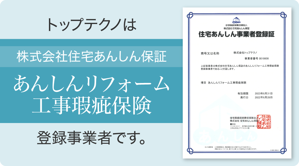 消費者が安心してリフォーム工事を行えるよう、第三者による検査と保証がセットになった、【リフォーム瑕疵(かし)保険】という住宅瑕疵担保履行法に基づく制度があります。万が一リフォーム工事部分に瑕疵が見つかった場合に修理費用を保険でまかなうことができ、工事業者が倒産した場合にはリフォーム発注者が直接保険金を受け取ることができます。 保険は、国土交通大臣から指定された住宅専門の保険会社(保険法人)が、建築士による現場検査を行ったうえで引き受けます。保険の加入手続きは工事業者が行いますので、リフォーム瑕疵保険をご希望の場合は、保険法人に登録しているリフォーム事業者へ依頼しましょう。トップテクノは、 (株)住宅あんしん保証 あんしんリフォーム工事瑕疵保険登録事業者です。