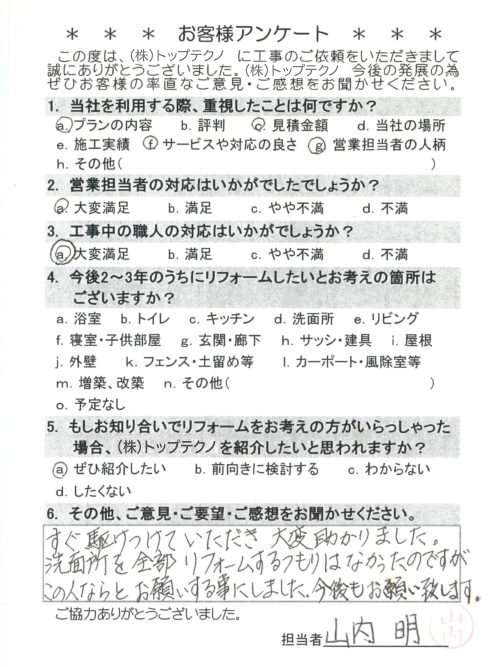 「すぐ駆けつけていただき 大変助かりました。 洗面所を 全部 リフォームするつもりはなかったのですが この人ならと お願いする事にしました。今後もお願い致します。」―洗面所リフォーム(八戸市 M様)