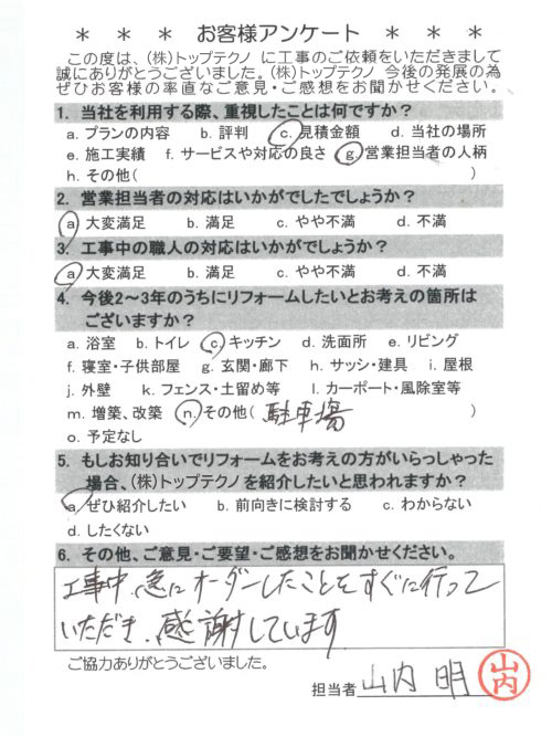工事中急にオーダーしたことをすぐに行っていただき、感謝しています。
